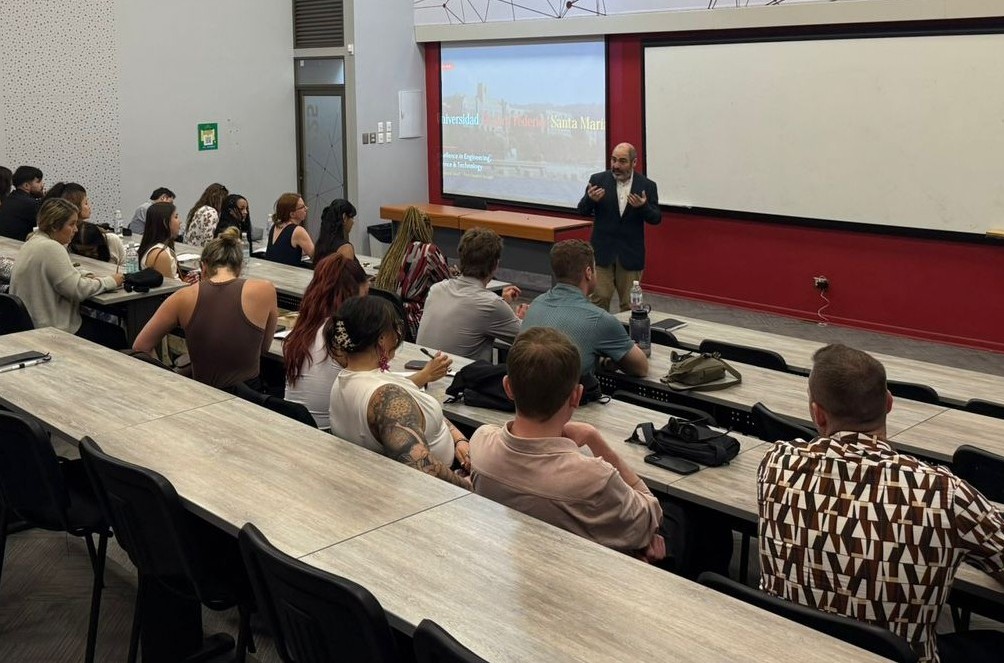 En este marco, el Dr. Juan Felipe Espinosa Cristia, académico del Departamento de Ingeniería Comercial de la USM, dictó una charla de presentación institucional titulada «Universidad Técnica Federico Santa María: Excellence in Engineering, Science & Technology». La actividad fue organizada por el profesor Francesco Pontarelli, quien también acompañó a los estudiantes durante su visita a la universidad y coordinó citas a otros sitios de interés regional como el Distrito de Innovacion V21 y el Puerto de Valparaíso, generando networking regional.